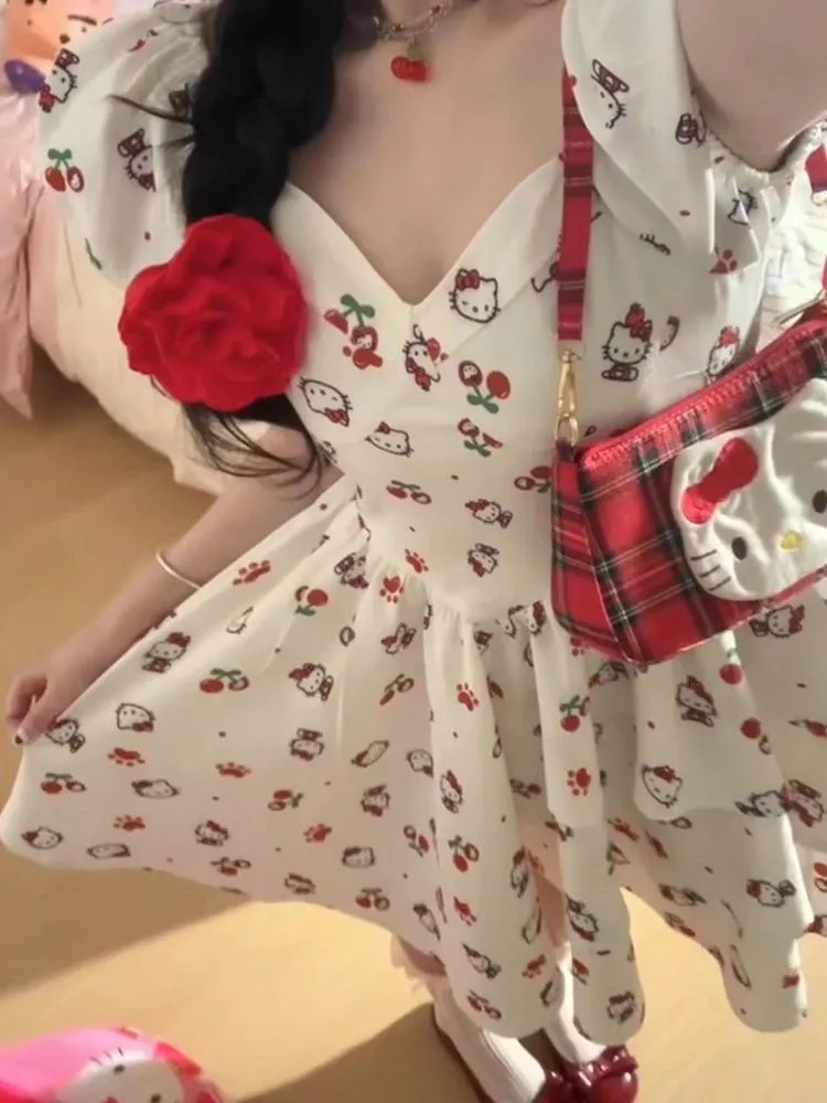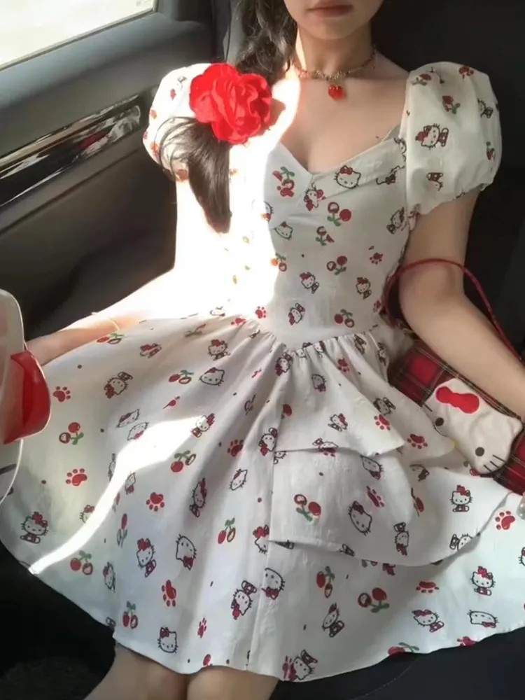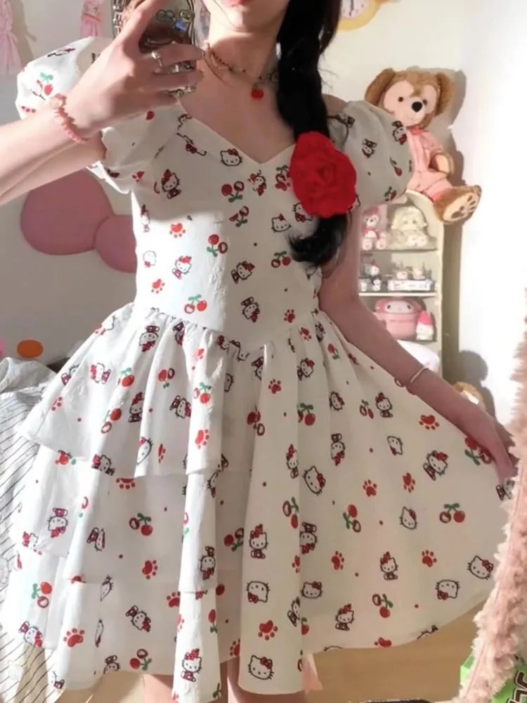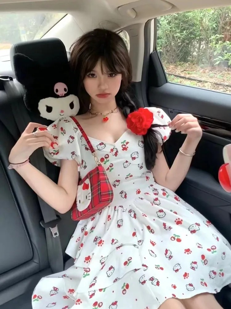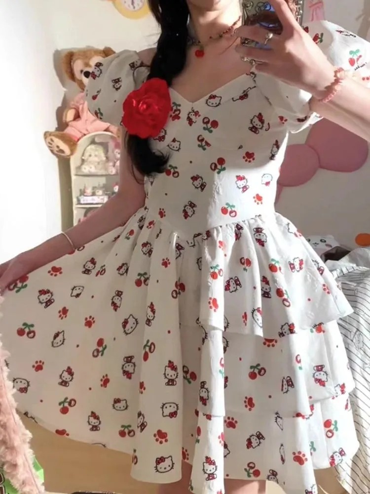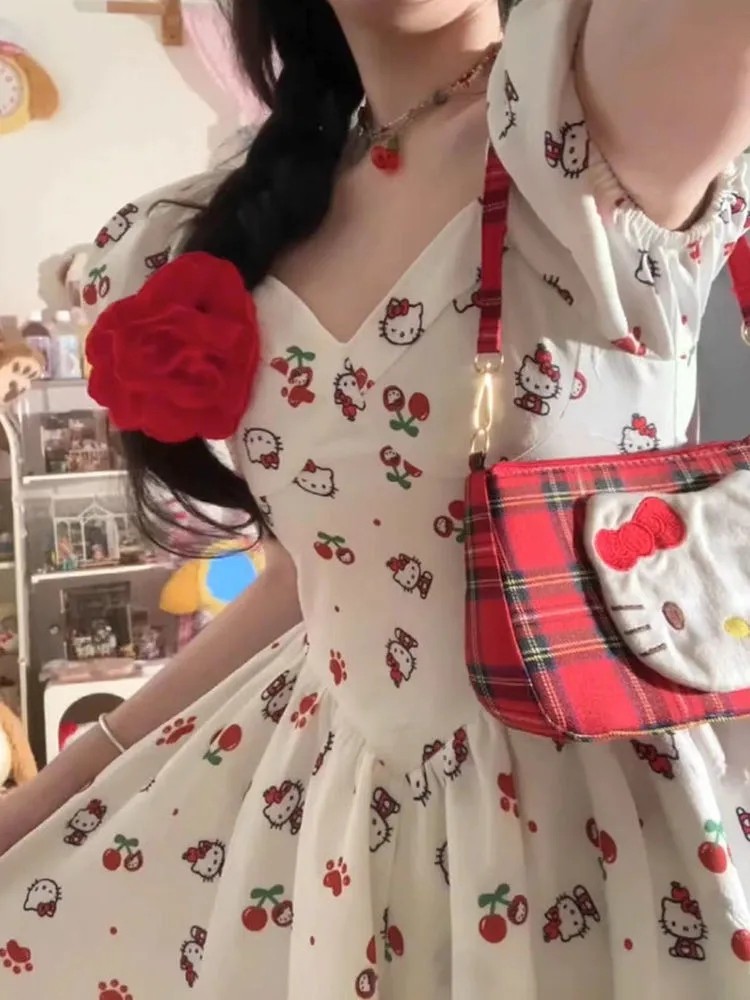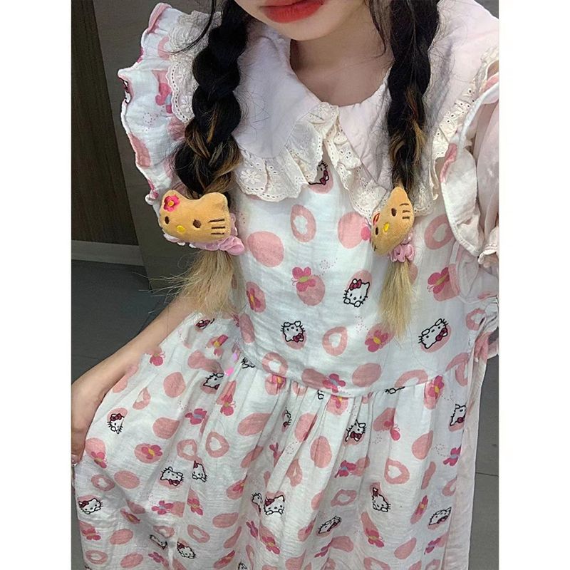 日系風甜美可愛HelloKitty印花設計感洋裝收腰顯瘦公主裙,免費贈送髮飾15個