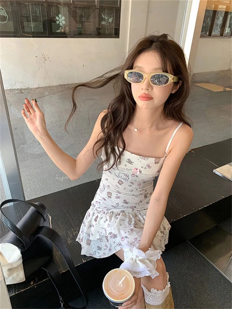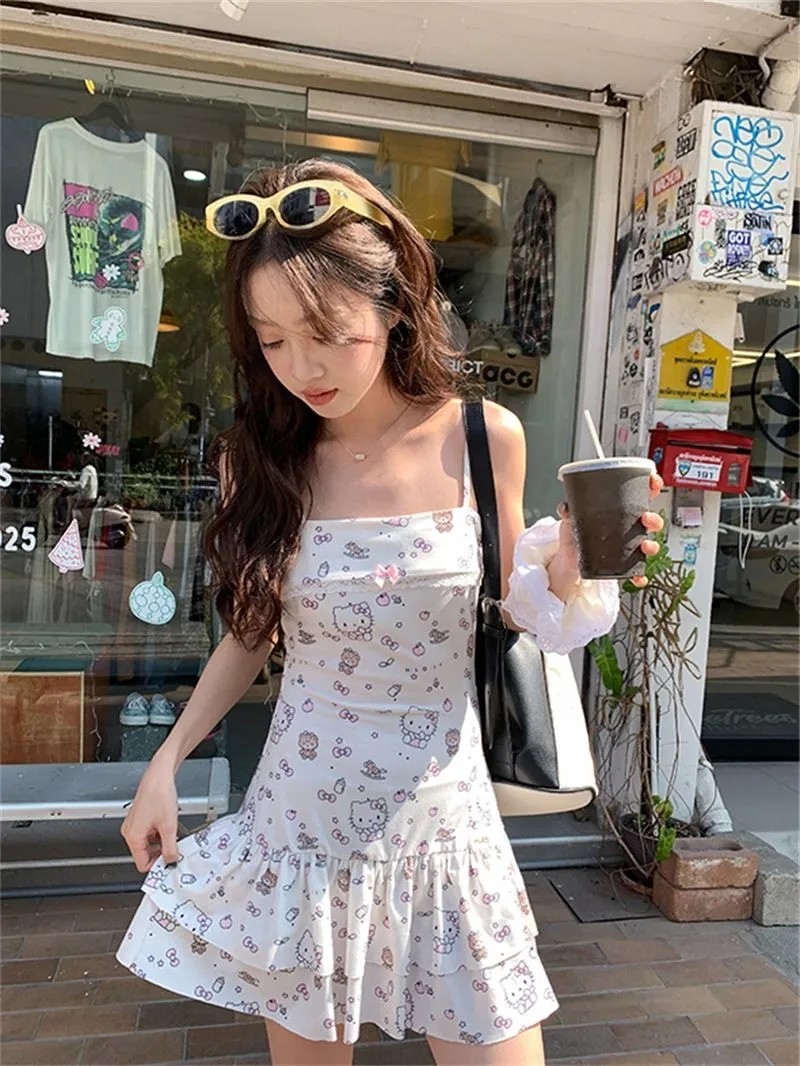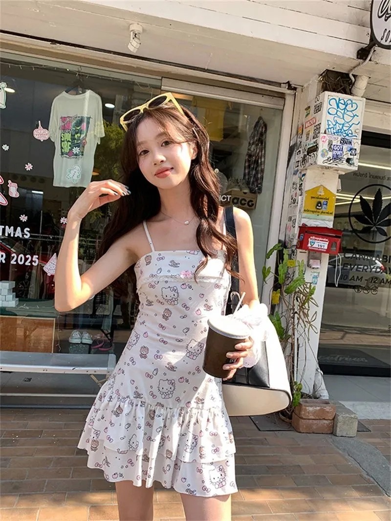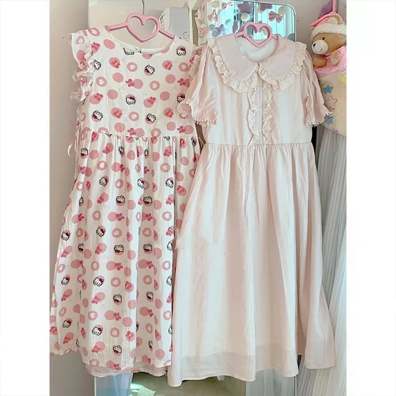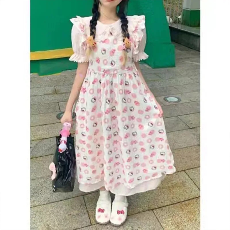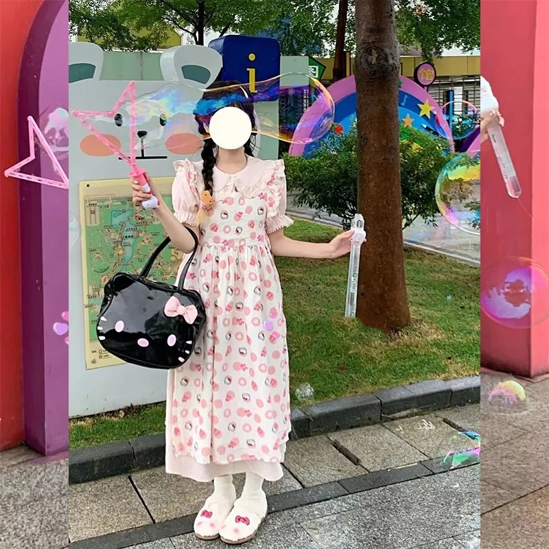 日系風甜美可愛HelloKitty印花設計感洋裝收腰顯瘦公主裙,免費贈送髮飾15個