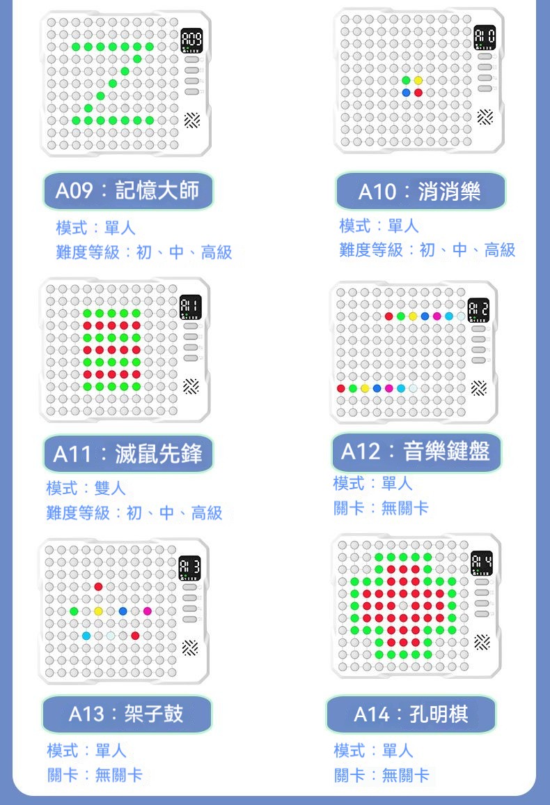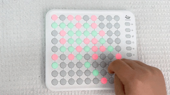 遊戲開始,語音播報“請找到所有的某色”,棋盤會亮起2種及以上的顏色,玩家在此時記住所有這個顏色的位置,隨後所有按鍵變滅,玩家需要憑記憶點亮正確的顏色。