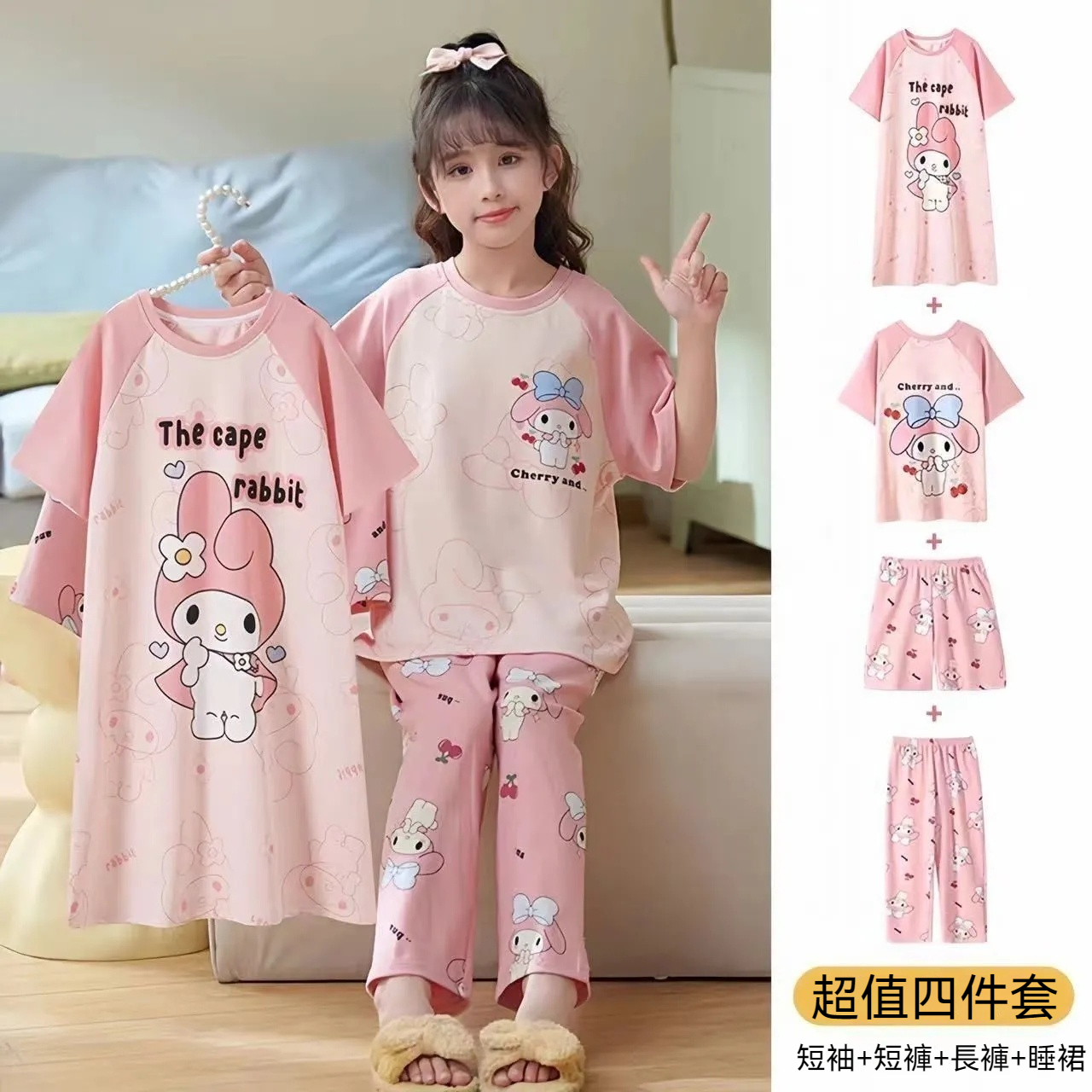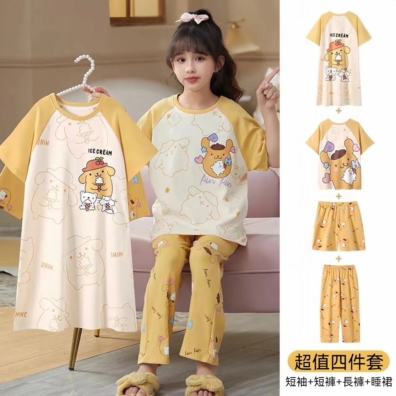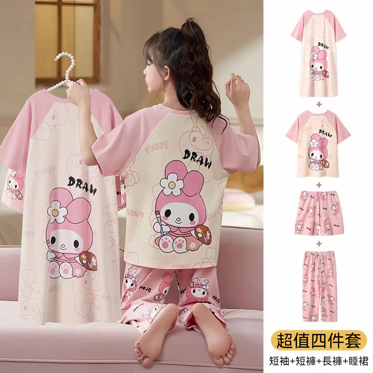 2025年新款兒童卡通短袖+短褲+長褲+睡裙超值四件家居服