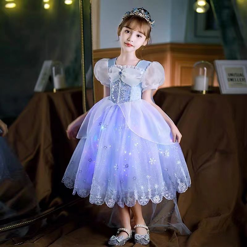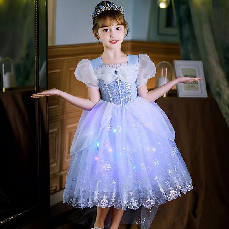 女童夏季短袖雪花繡花公主裙+皇冠魔法棒+彩色燈帶,生日派對連衣裙【免費贈送項鏈+額鏈套裝】