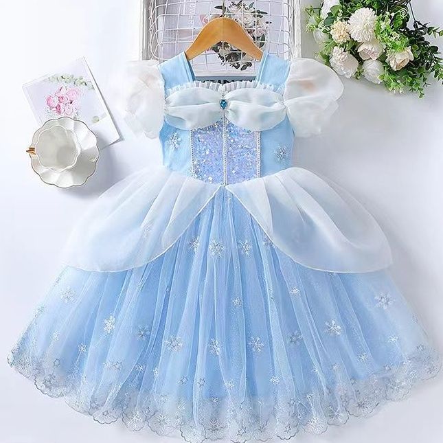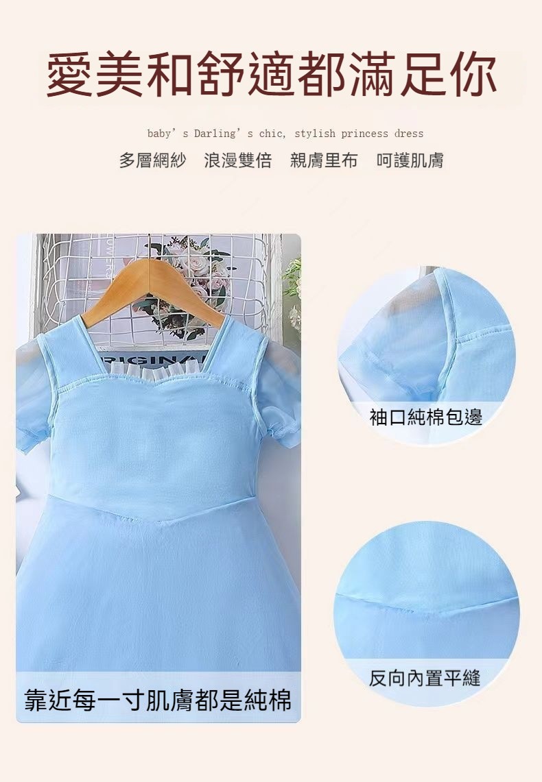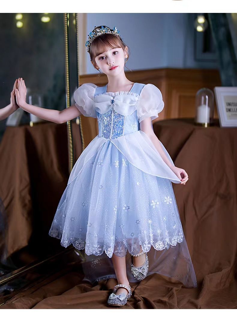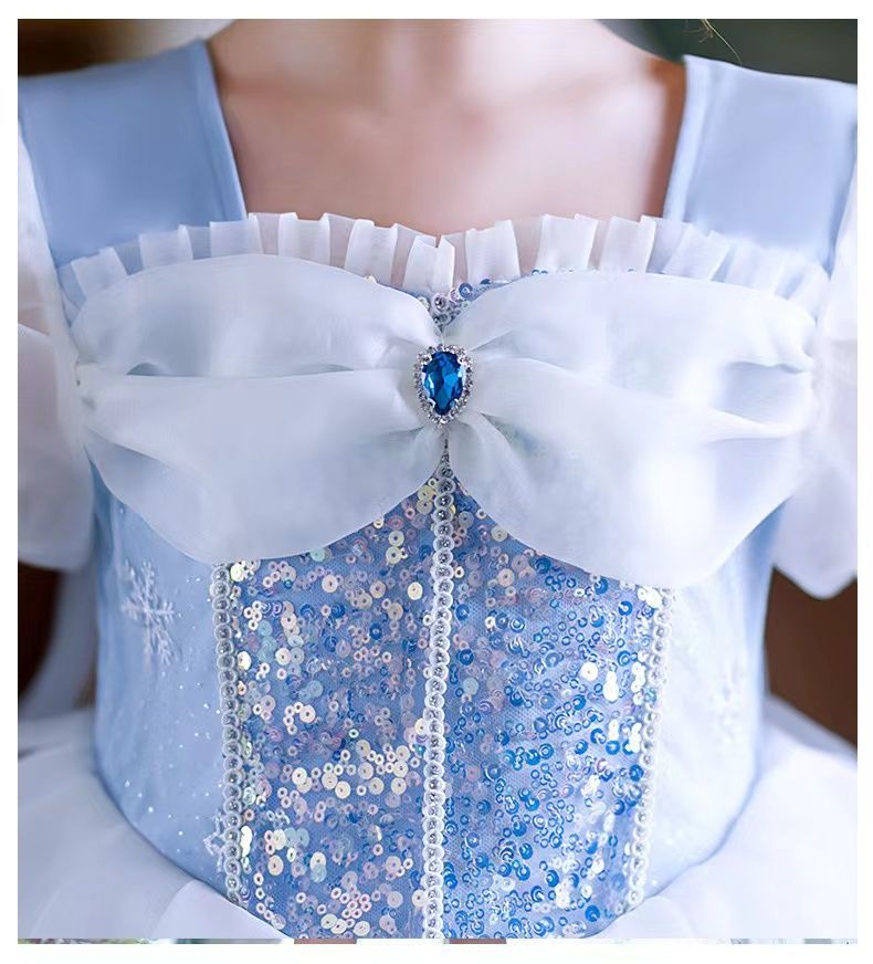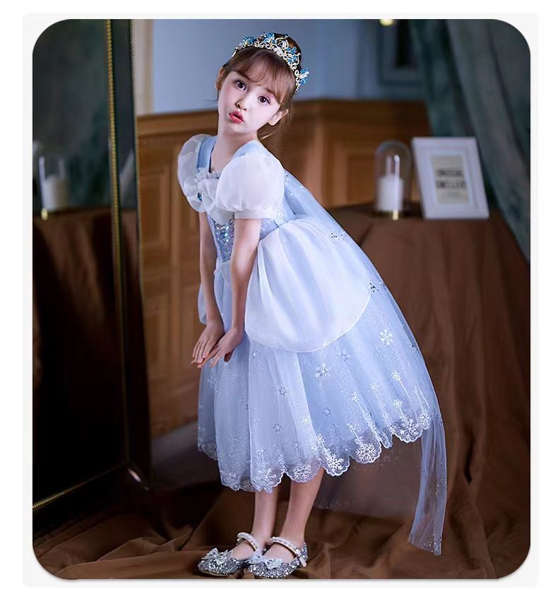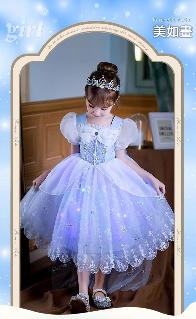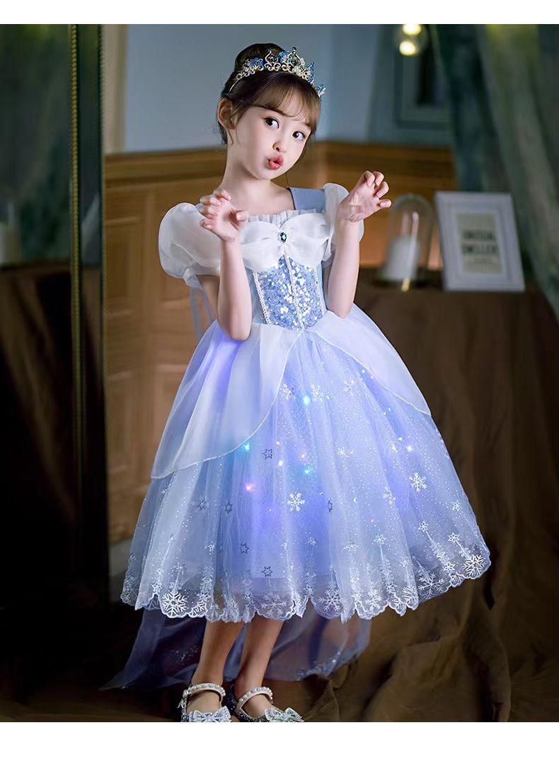 女童夏季短袖雪花繡花公主裙+皇冠魔法棒+彩色燈帶,生日派對連衣裙【免費贈送項鏈+額鏈套裝】 NT$ 1299